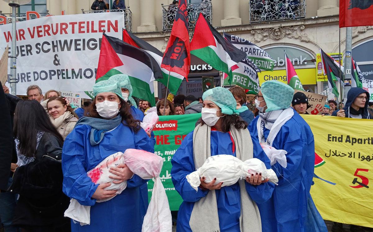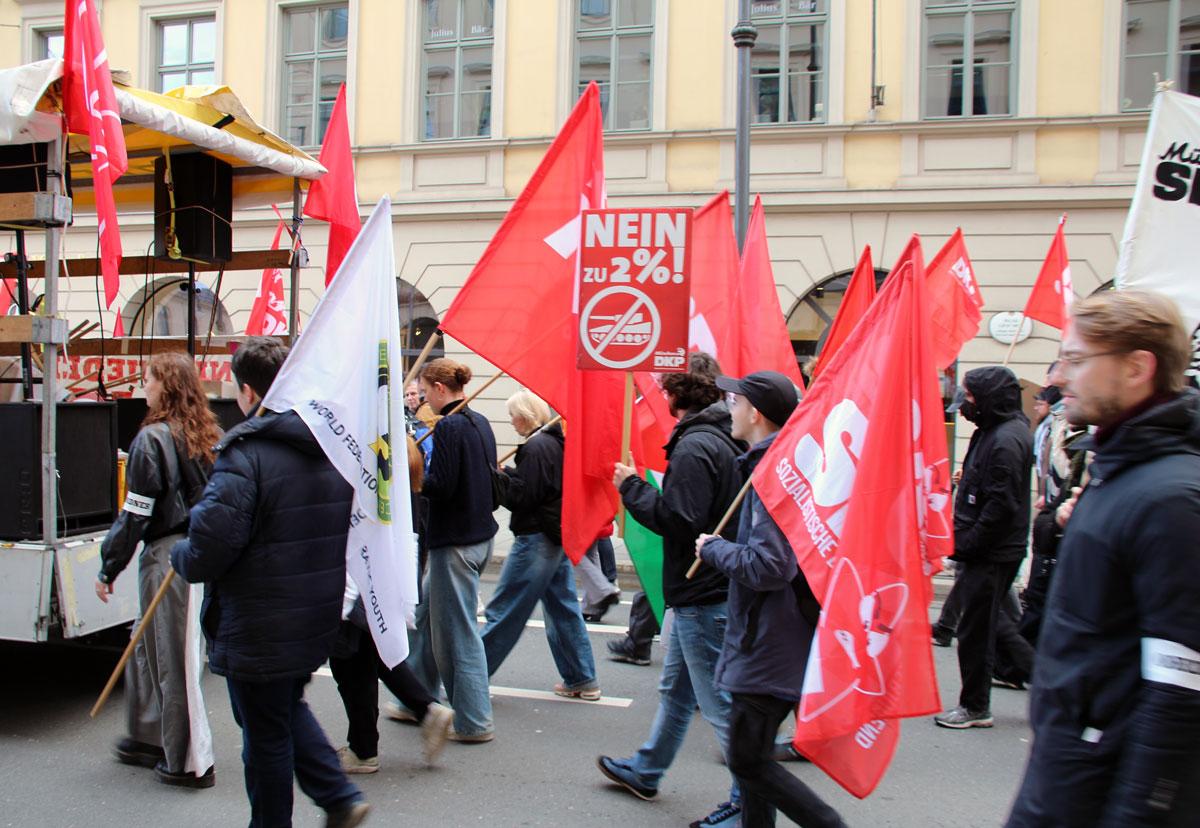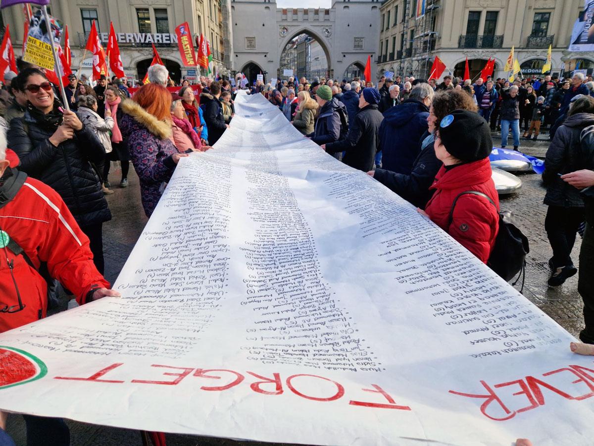 Rund 5.000 Menschen haben am Samstag unter dem Motto „Kriegstreiber unerwünscht!“ gegen die „Sicherheitskonferenz“ in München demonstriert. Eigene Blocks stellten unter anderem die DKP und SDAJ auf die Beine. Eine Gruppe als Mediziner Verkleidete führte einen großen Block der Palästina-Solidarität an. Sie trugen blutige Bündel in den Armen, die ermordete Babys symbolisierten. Ihr Banner war das längste: Auf 45 Metern verzeichnete es die Namen von 5.000 Menschen, die Israels Armee in Gaza ermordet hat. Für die insgesamt über 30.000 Opfer dieses Krieges reichte der Platz nicht.