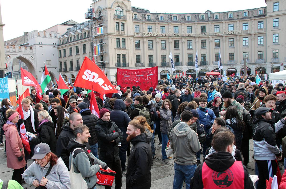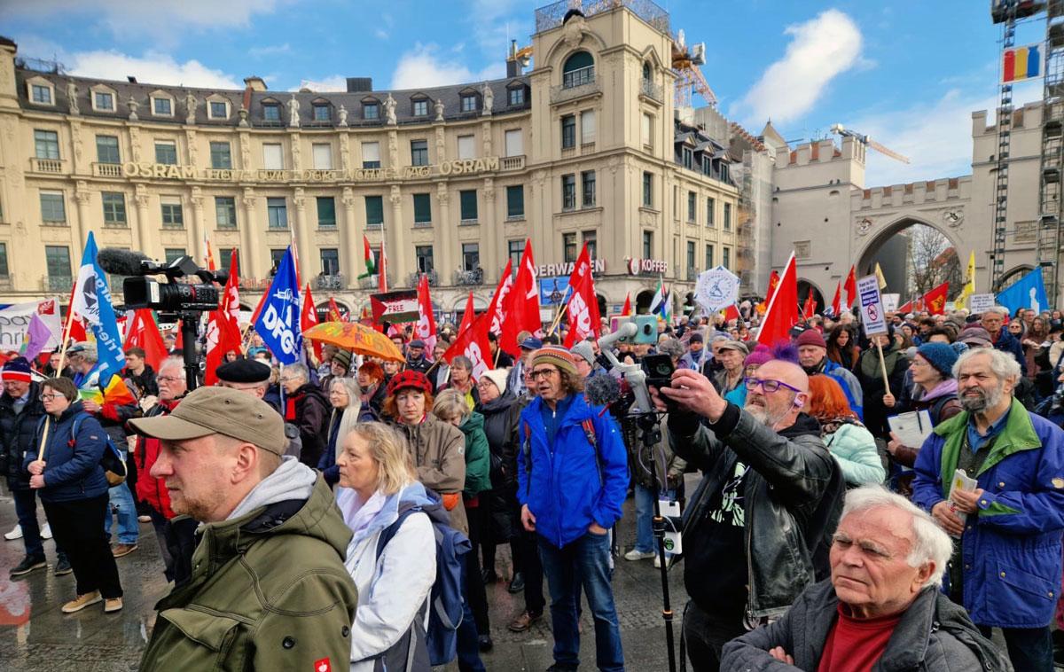 Auf der Abschlusskundgebung am Marienplatz prangerte die irische EU-Abgeordnete Clare Daly den Völkermord Israels an, der live in Sozialen Medien übertragen werde, sowie die Komplizenschaft der EU und USA dabei. Der Oberstleutnant a. D. Jürgen Rose nannte das Treffen von Regierungsvertretern, Militärs und Rüstungslobbyisten im Luxushotel Bayerischer Hof eine „Unsicherheitskonferenz“. Ohne die NATO-Osterweiterung stünden heute keine russischen Truppen in der Ukraine.