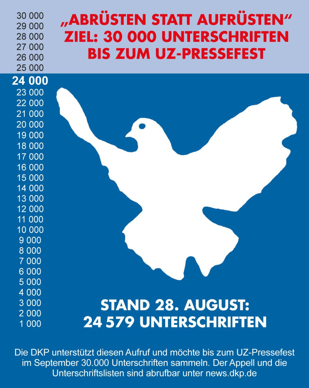 30 000 Unterschriften unter den Aufruf „Abrüsten statt Aufrüsten“ will die DKP bis zum UZ-Pressefest in der nächsten Woche gesammelt haben. Dort wird sie die Unterschriften beim „Internationalen Antikriegsmeeting“ an die Organisatoren der Kampagne übergeben. Für die DKP wird der Parteivorsitzende Patrik Köbele sprechen, für die Kampagne „Abrüsten statt Aufrüsten“ Rainer Braun, außerdem Vertreter internationaler kommunistischer Parteien und Egon Krenz für ein Land, das Garant für den Frieden war. Denn das UZ-Pressefest ist ein Fest des Friedens und der internationalen Solidarität.