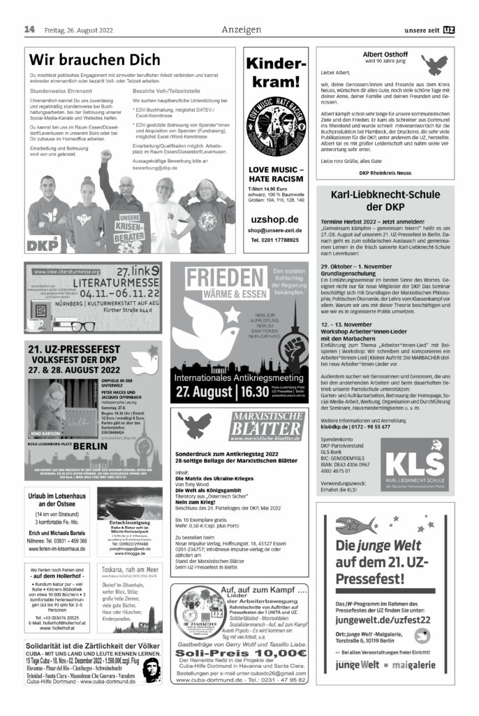Dieser Artikel ist für Sie kostenlos. Kritischer Journalismus braucht allerdings Unterstützung, um dauerhaft existieren zu können. Daher freuen wir uns, wenn Sie sich für ein Abonnement der UZ (als gedruckte Wochenzeitung und/oder in digitaler Vollversion) entscheiden. Sie können die UZ vorher 6 Wochen lang kostenlos und unverbindlich testen.