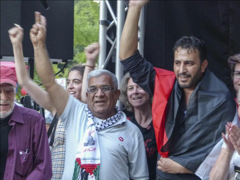 Die Genossen aus Palästina während der Begrüßung der internationalen Gäste auf den UZ-Friedenstagen. (Foto: Martina Lennartz)