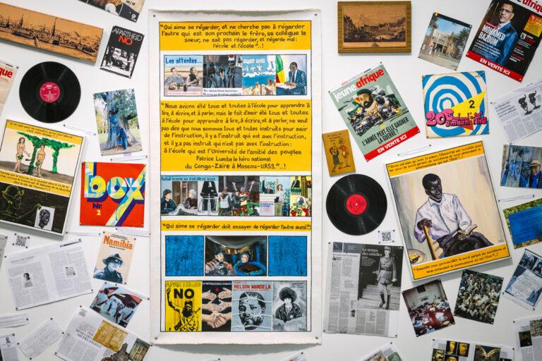 Am Anfang war die Solidarität: Ein großformatiges Markenheft des Freien Deutschen Gewerkschaftsbundes zieht den Blick auf sich, daneben Fotos schulischer Sammelaktionen. „Monatlich übten wir bis …