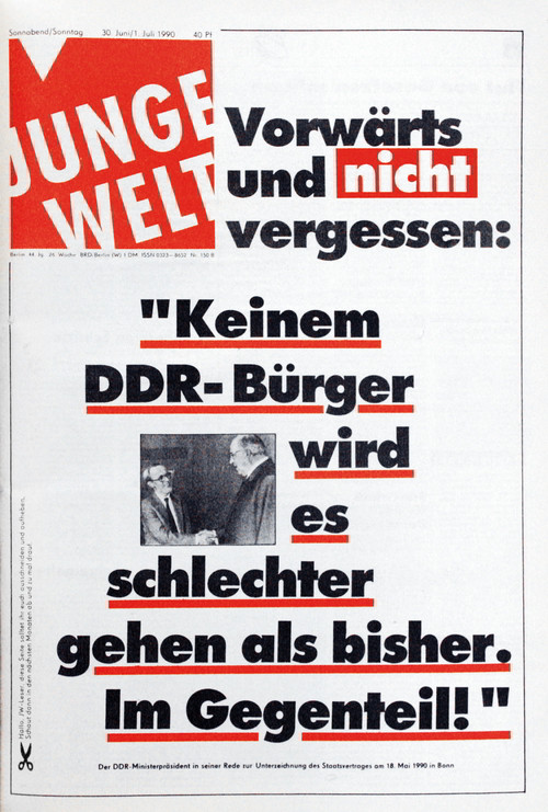 Ab dem 10. Januar 1990 nannte sich die „Junge Welt“ „Linke Sozialistische Tageszeitung“, wurde 1991 von einer Westberliner Mediengruppe bei einer Auflage von 170 000 Exemplaren übernommen, und erschien ab 9. Mai 1994 als „junge Welt“ mit einem neuen Layout, das erst 2014 modifiziert wurde. Am 5. April 1995 meldete der Verleger jedoch bei einer Auflage von gut 17 000 Exemplaren Insolvenz an. Ein Teil der noch rund 50 Mitarbeiter gründete aber den Verlag 8. Mai GmbH, in dem die Zeitung seit dem 21. April 1995 erscheint. Zwei Jahre später wurde die Redaktion durch eine „antideutsche“ Gruppierung unter Führung von Jürgen Elsässer gespalten und die Wochenzeitung „Jungle World“ gegründet. Das hatte weitere Auflagenverluste zur Folge, die erst seit Anfang des vergangenen Jahrzehnts kompensiert werden konnten. 2017 ist eine verkaufte Auflage von etwa 20 000 Exemplaren erreicht. Die Zeitung scheint „unbankrottbar“, ist es aber selbstverständlich nicht: Ohne Abonnentenzuwachs geht auf Dauer nichts mehr, das gilt auch für ihren Internetauftritt. Was die deutschen Medienkonzerne mit den bisherigen Organisationsstrukturen des Tageszeitungsvertriebs machen, ist von deren Rendite abhängig.