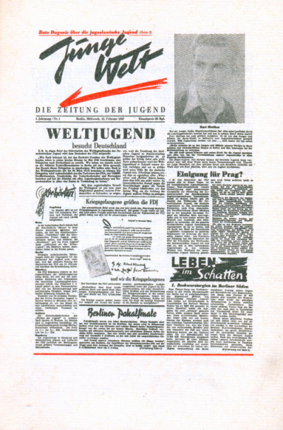 Antifaschismus und antiimperialistische Solidarität standen am Anfang der Zeitung und bestimmen ihr heutiges politisches Profil. Am 12. Februar 1947 erschien die erste Ausgabe der Wochenzeitung „Junge Welt“ als Organ der ein Jahr zuvor gegründeten Freien Deutschen Jugend (FDJ). Erich Honecker, damals deren 35-jähriger Vorsitzender, zwei Jahre zuvor nach zehn Jahren Haft aus dem Zuchthaus Brandenburg befreit, schrieb im Geleitwort: „Die Junge Welt wird unentwegt für Frieden, Freiheit und Recht eintreten. Sie wird die freundschaftlichen Beziehungen zur Weltjugend pflegen und die Einigungsbestrebungen der deutschen Jugend fördern.“