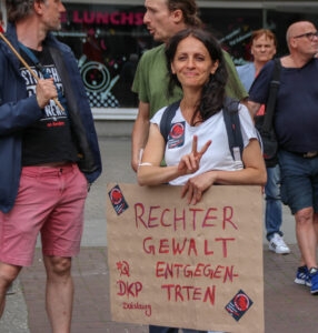 Die Demonstrierenden kamen nicht nur aus Oberhausen, sondern auch aus anderen NRW-Städten. Zahlreiche antifaschistische Initiativen, migrantische linke Verbände, die Linksjugend und viele andere reisten an, um sich zu solidarisieren, aber auch um die gesellschaftliche Dimension rechten Terrors zu thematisieren. Denn auch in anderen Städten sind Parteien und soziale Institutionen, Autonome Zentren oder Geflüchteteneinrichtungen bereits Opfer rechter Anschläge geworden. Erst vor kurzem war in Erkelenz ein Grüne-Lokalpolitiker Opfer eines antisemitischen Anschlags geworden, die Liste ließe sich fortführen. Eine Aufklärung dieser Angriffe durch staatliche Behörden ist, gemessen an vergangenen Attacken, nicht sehr wahrscheinlich, dennoch forderten mehrere Rednerinnen und Redner eine lückenlose Aufarbeitung und konsequente Strafverfolgung der Täter. Überwältigend ist auch die große Anteilnahme aus der gesamten Bundesrepublik und dem Ausland. Dass der Sprengsatz von Rechten gelegt wurde, bezweifelt niemand von denjenigen, die sich solidarisch zu Wort melden.