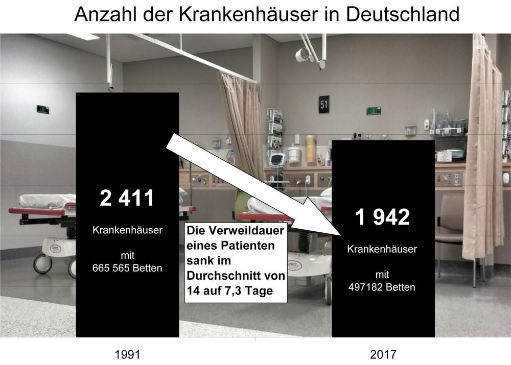 Prof. Karl Lauterbach (SPD) hatte schon 2003 in seinem Buch „DRG in deutschen Krankenhäusern“ vorgerechnet, dass 1 410 der damals 2 242 Krankenhäuser überflüssig sein sollen. Im Jahr 2016 waren nur noch 1 951 Krankenhäuser mit 489 718 Betten übrig. Der Nationalen Akademie der Wissenschaften Leopoldina in Halle war das immer noch zu viel. In ihrem wissenschaftlich verbrämten Thesenpapier heißt es: Hätte Deutschland die Krankenhausstruktur von Dänemark mit einem Krankenhaus pro 250000 Einwohner, wären es bei uns 330 …“ und „das heißt: wäre Deutschland im OECD-Vergleich durchschnittlich, hätte es insgesamt nur rund 320 000 Betten, also rund 35 Prozent weniger“. Dass ein solcher Umbau der Krankenhauslandschaft nach Boris Augurzki, RWI-Mitarbeiter an der oben genannten Bertelsmann-Studie, den Staat Dänemark zirka 6 Mrd. Euro kostet, auf unsere Verhältnis umgerechnet 80 Mrd. Euro, wird in den Medien nicht so breitgetreten.