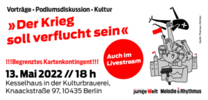 Stefan Huth: Es gibt schon Leute, die finden den Slogan zu alarmistisch, meinen, er sei nicht gedeckt durch die aktuelle Entwicklung. Wir haben ihn natürlich bewusst so gewählt, denn wie der Zweite Weltkrieg nicht an 1. September 1939 begann, sondern auch eine Vorgeschichte von Aggressionen hatte, in Spanien etwa oder der Tschechoslowakei, besteht die reale Gefahr, dass der Ukrainekrieg einmal als ukrainische Phase eines dritten Weltkriegs in die Geschichte eingehen wird. Von der NATO wird ja direkt auf eine Konfrontation gegen Moskau und Beijing hingearbeitet, und das ist sicher keine Verschwörungstheorie. Es gibt entsprechende Stellungnahmen und Strategiepapiere auf der einen Seite. Und das Faktum auf der anderen, dass der westliche Imperialismus sich im Abschwung befindet, sein Hegemoniemodell bedroht ist und die USA als führende Kraft in der NATO gerade einen Überlebenskampf auskämpfen. Insofern kann man uns keine Realitätsverweigerung vorwerfen. Wenn man sich die Fakten anguckt, ist es schlimm genug, was da konkret geplant wird.