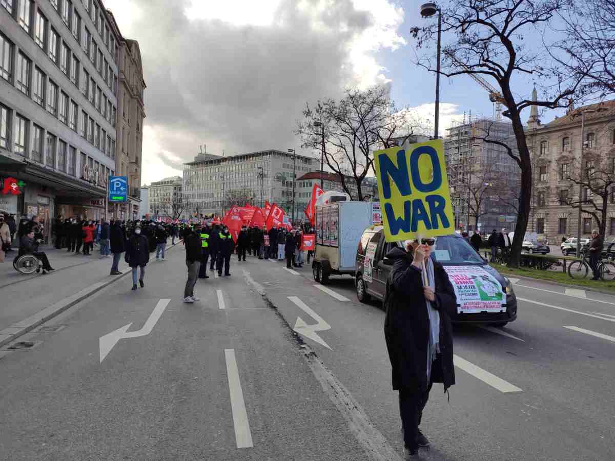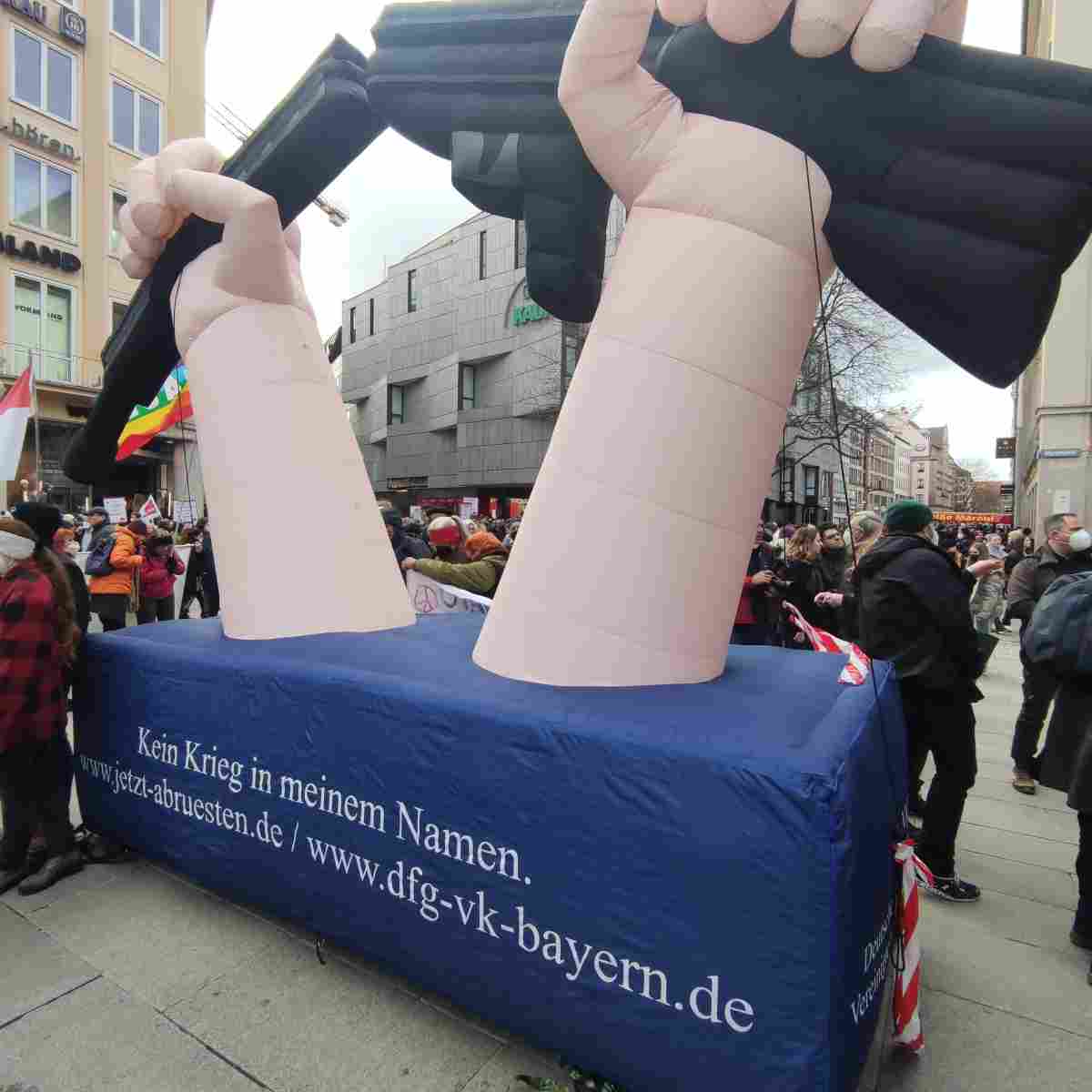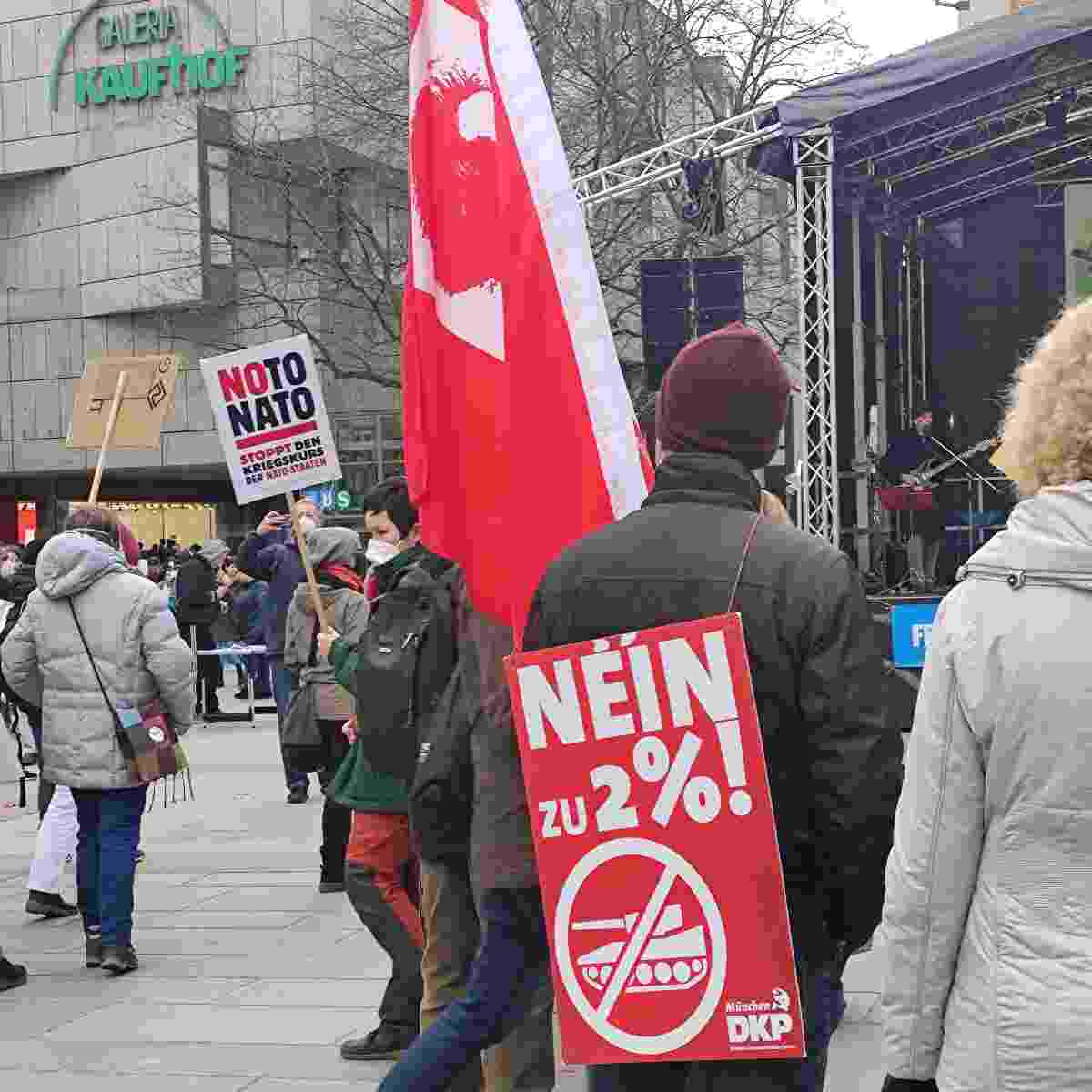 Draußen, vor dem Bayerischen Hof, interessierte sich niemand für die Frage, ob perspektivisch lieber EU-geführte oder NATO-geführte Truppen an der russischen Westgrenze aufmarschieren sollen. Das „Aktionsbündnis gegen die NATO-Sicherheitskonferenz“ hatte zur Umzingelung des Tagungsortes als Protest gegen deren Kriegspolitik aufgerufen. Obwohl die Polizei von weniger Teilnehmern berichtet, konnten die Veranstalter über 3.000 Demonstrierende zählen – Das sind fast so viele Menschen wie die Anzahl an Polizisten, die für die Festung Münchner Sicherheitskonferenz im Einsatz waren.