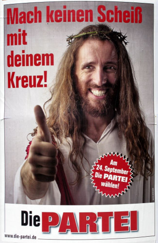 Ein Wahlplakat der PARTEI, welches den Unmut der großen Kirchen in Deutschland auf sich zog.