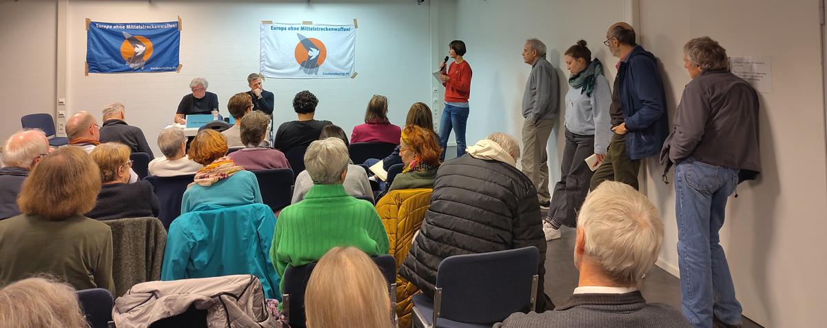 Mark Ellmann, Leiter der Friedenskommission der DKP, warb in der Diskussion für die Arbeit mit dem Berliner Appell. Die geplante Raketenstationierung sei noch immer kaum bekannt. Dem schloss sich Jutta Kausch-Henken in ihrem Schlusswort an: „100.000 Unterschriften reichen bei weitem nicht.“