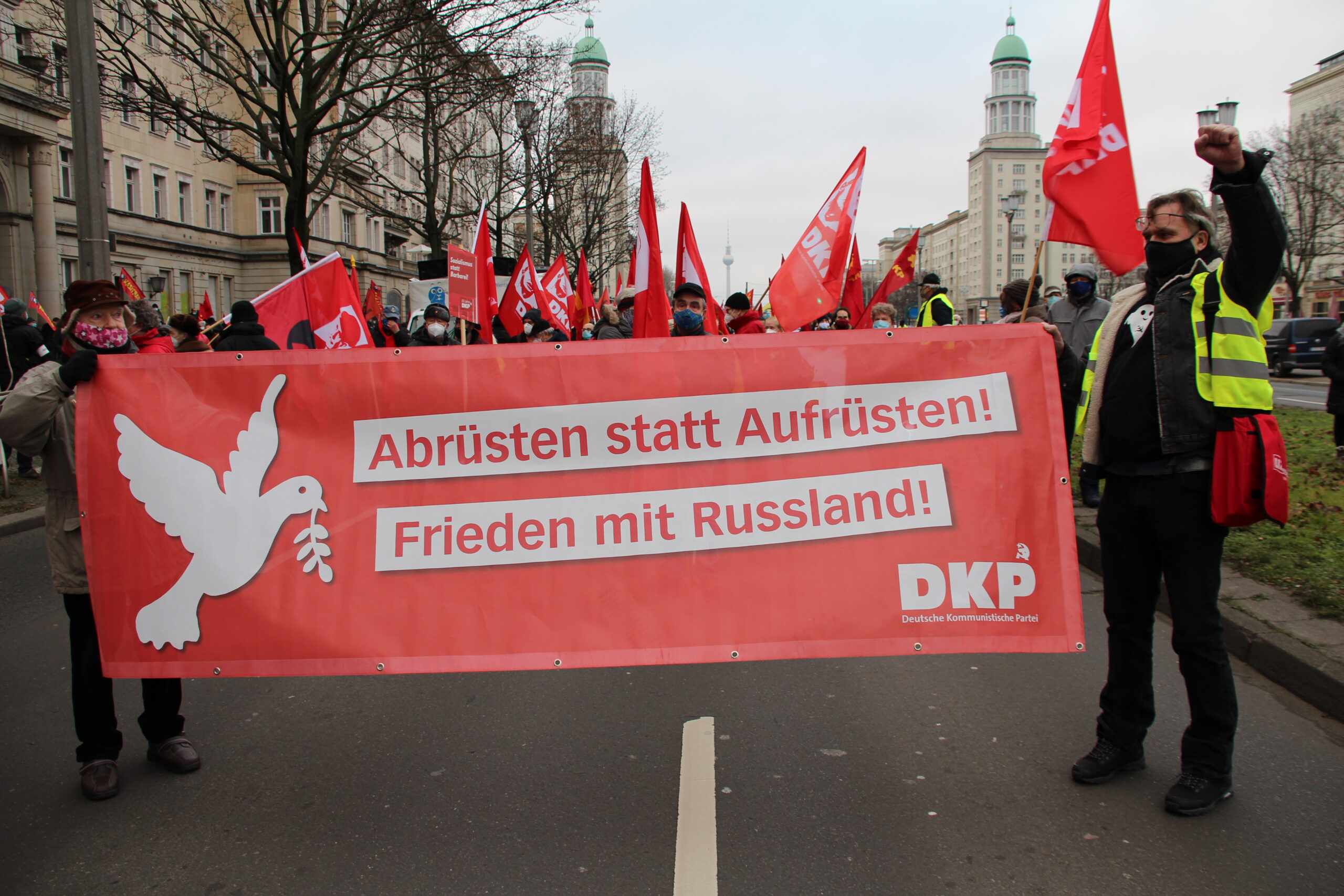 „Rosa Luxemburg und Karl Liebknecht kämpften für eine ausbeutungsfreie und friedliche Gesellschaft, für den Sozialismus. Ihrer zu gedenken heißt heute: Kriegspolitik stoppen! Runter mit der Rüstung!“ Mit diesen Worten auf einem Plakat, das der UZ beilag, hatte die DKP ihre Mitglieder und Freunde aufgerufen, am 10. Januar zur LL-Demo nach Berlin zu fahren – beziehungsweise Ehrungen vor Ort zu organisieren, wenn eine Anreise pandemiebedingt nicht möglich oder sinnvoll war.