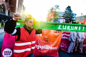 In der vergangenen Woche wehten in der Nacht von Montag auf Dienstag rote Fahnen vor dem Werkstor von Buderus Guss in Breidenbach. Bengalos erhellten den Nachthimmel über dem hessischen Lahn-Dill-Bergland. Aus der Lautsprecheranlage erklang „There is power in the union. There is power in the hand of the workers“, eine Hymne von Billy Bragg auf die streikenden Bergarbeiter in den 1980er Jahren in Britannien. Die IG Metall hatte die Nachtschicht ... Bitte hier anmelden