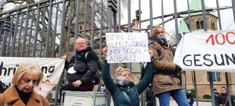 Protest gegen das Hochrüstungspaket der Bundesregierung in Essen anlässlich eines Wahlkampfauftrittes von Kanzler Olaf Scholz (SPD) am 3. April. (Foto: DKP Essen)